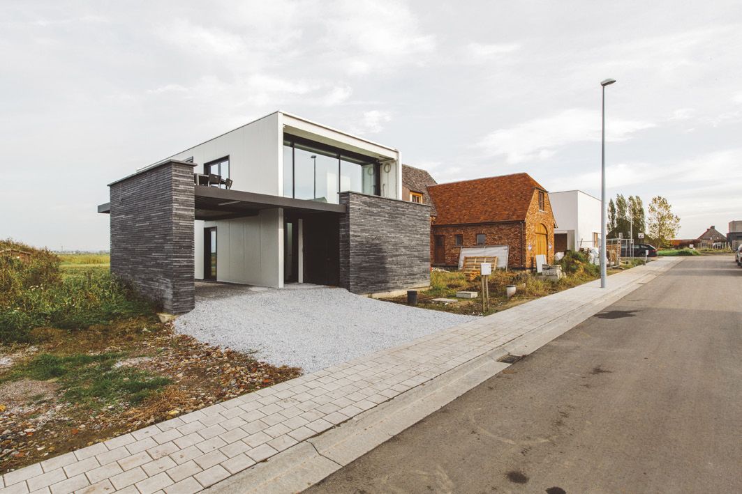 La structure portante simple est constituée d’une construction en acier laqué noir qui reste visible, revêtue sur la face extérieure de panneaux sandwich en acier plat. Tant la façade que la toiture ont été réalisées à partir des mêmes panneaux. Ce produit all-in-one remplace jusqu’à 5 couches différentes dans le mur creux traditionnel. De cette façon, l’épaisseur du mur extérieur de la maison passive a été limitée à 22 cm.