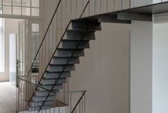 Lors de la rénovation de cette maison de maître, tous les escaliers ont aussi été rénovés. L’architecte et le maître d’ouvrage ont opté pour une fine construction métallique : une tôle pliée de 4 mm pour les marches, un carré massif en acier étiré de 20/20 mm pour les limons, en combinaison avec 10 mm pour les balustrades. L’acier blanc avec une finition vernissée mate renforce cette structure aérienne.