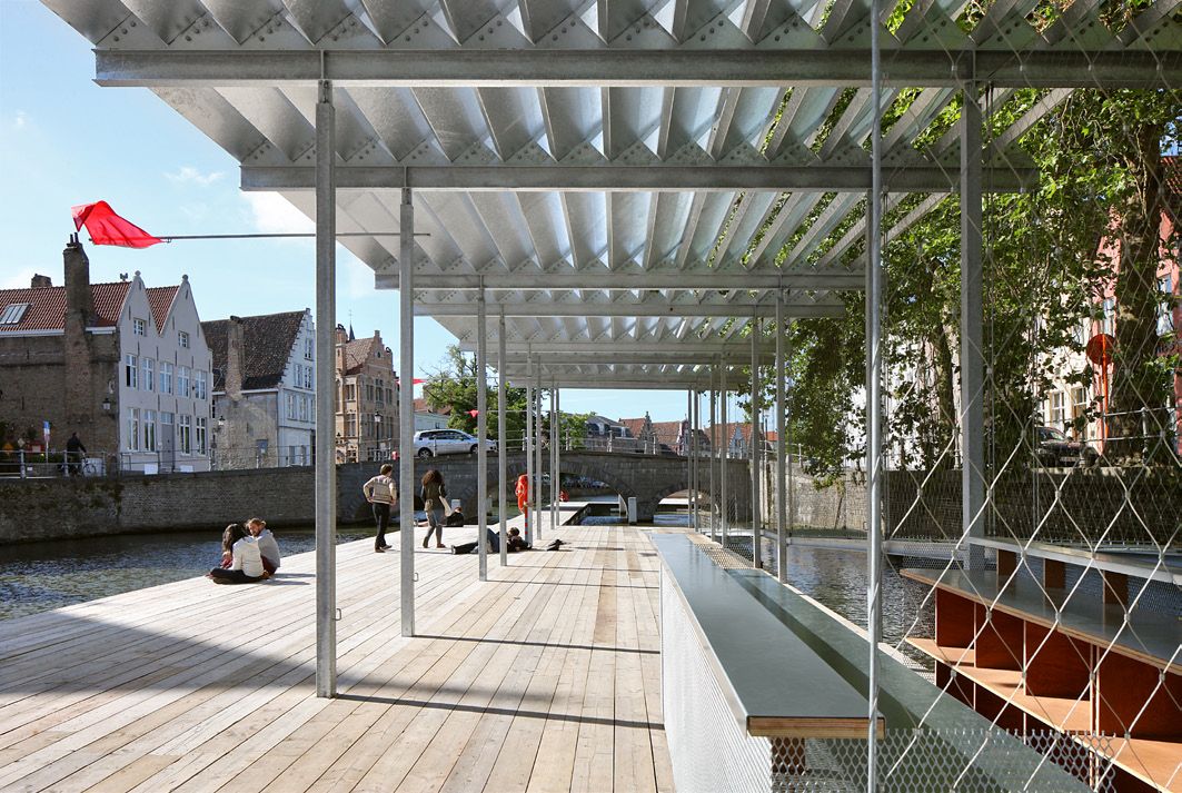 Dans le cadre de la Triennale Bruges 2015, cet espace public multifonction temporaire a été créé. De chaque côté du Carmersbrug, des plates-formes ont été placées, reliées entre elles par une banquette sous-jacente. Les concepteurs ont opté pour une structure en acier galvanisé avec des colonnes en acier élancées qui partent d’une grille en acier, fixée sur des pontons flottants. La toiture comporte un certain nombre de tôles en acier fines avec bords pliés, qui assurent la rigidité et évitent le flambage.