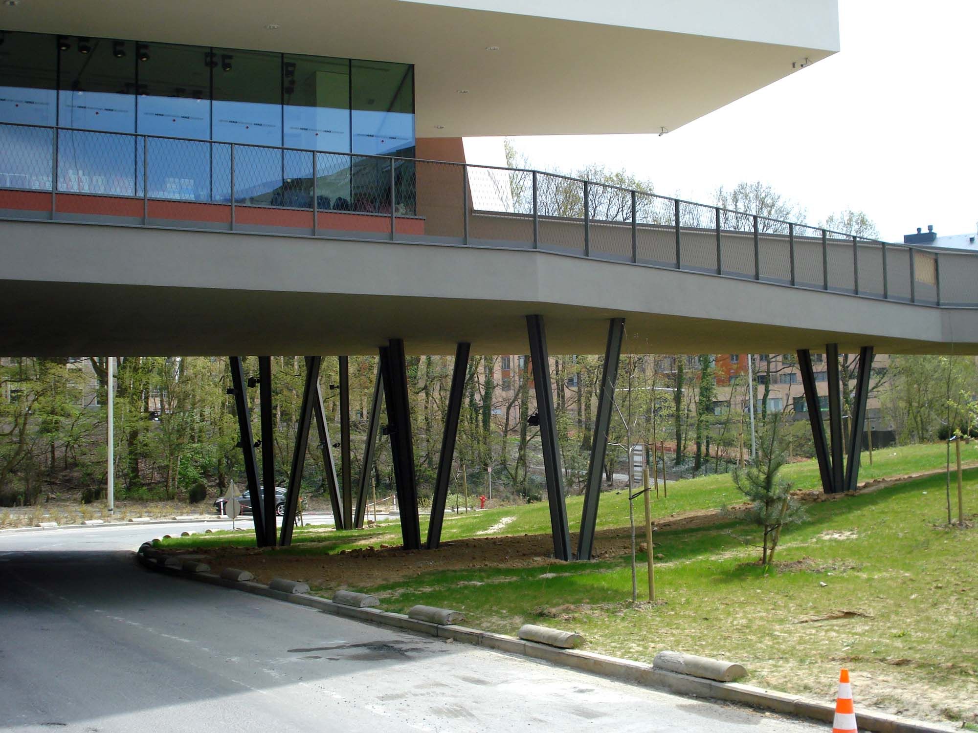 Le nouveau musée Hergé se situe à l’orée du bois de la Source et surplombe l’Anneau Central à Louvain-la-Neuve. C’est côté ouest, que se trouve l’entrée du public. Un vaste espace lumineux distribue quatre entités qui abritent une cafétéria, une boutique, une salle d’expositions temporaires, des sanitaires/ vestiaires et le poste de sécurité. Des passerelles permettent aux visiteurs de passer d’une entité à l’autre. Afin de pouvoir enjamber l’anneau central sur des portées assez considérables, il a fallu insérer des éléments porteurs verticaux les plus légers possibles pouvant donner l’impression que le volume flotte au dessus de la route dans un entourage verdoyant. Pour atteindre cet objectif, la seule possibilité était l’utilisation de l’acier en profilés reconstitués sous forme de tripodes s’élargissant comme un éventail régulier depuis leur base vers les appuis sous la dalle du musée.