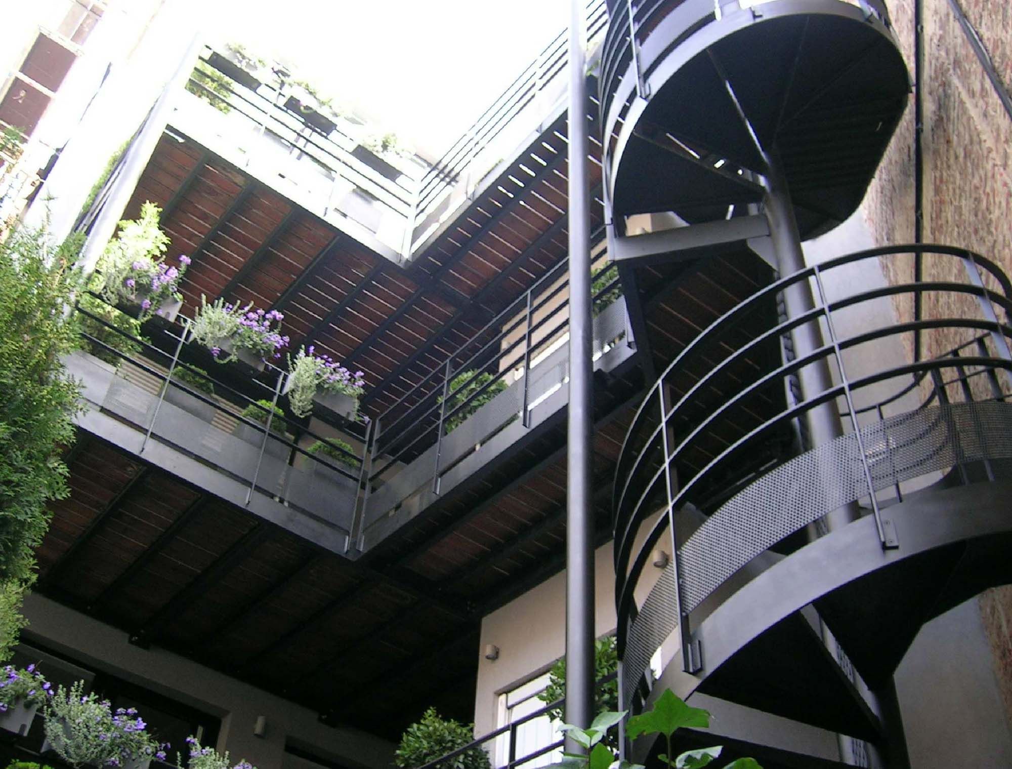 Dans ce projet, la partie supérieure de l’immeuble est traitée en duplex inversé. Une rehausse en ossature bois et acier a été construite afin de loger le salon du duplex. Afin de permettre l’accès aux logements, une structure tridimensionnelle métallique associée à une ‘tour’ en béton, gaine de l’ascenseur, a été construite dans la cour de séparation entre les 2 immeubles. La structure est légère et associée aux terrasses présentant une végétation luxuriante. La structure de l’escalier et du palier devant l’ascenseur est composée de 3 tubes de soutien, d’un limon plat et de marches en tôle larmée pliée. La structure métallique du palier et des terrasses est recouverte de Bangkiraï. Elle a reçu un traitement de métallisation à chaud. D’une manière générale, les mains courantes des garde-corps sont faites en tubes de 48 mm avec des coudes de fixation ronds, des montants plats et une allège inférieure en tôle perforée.