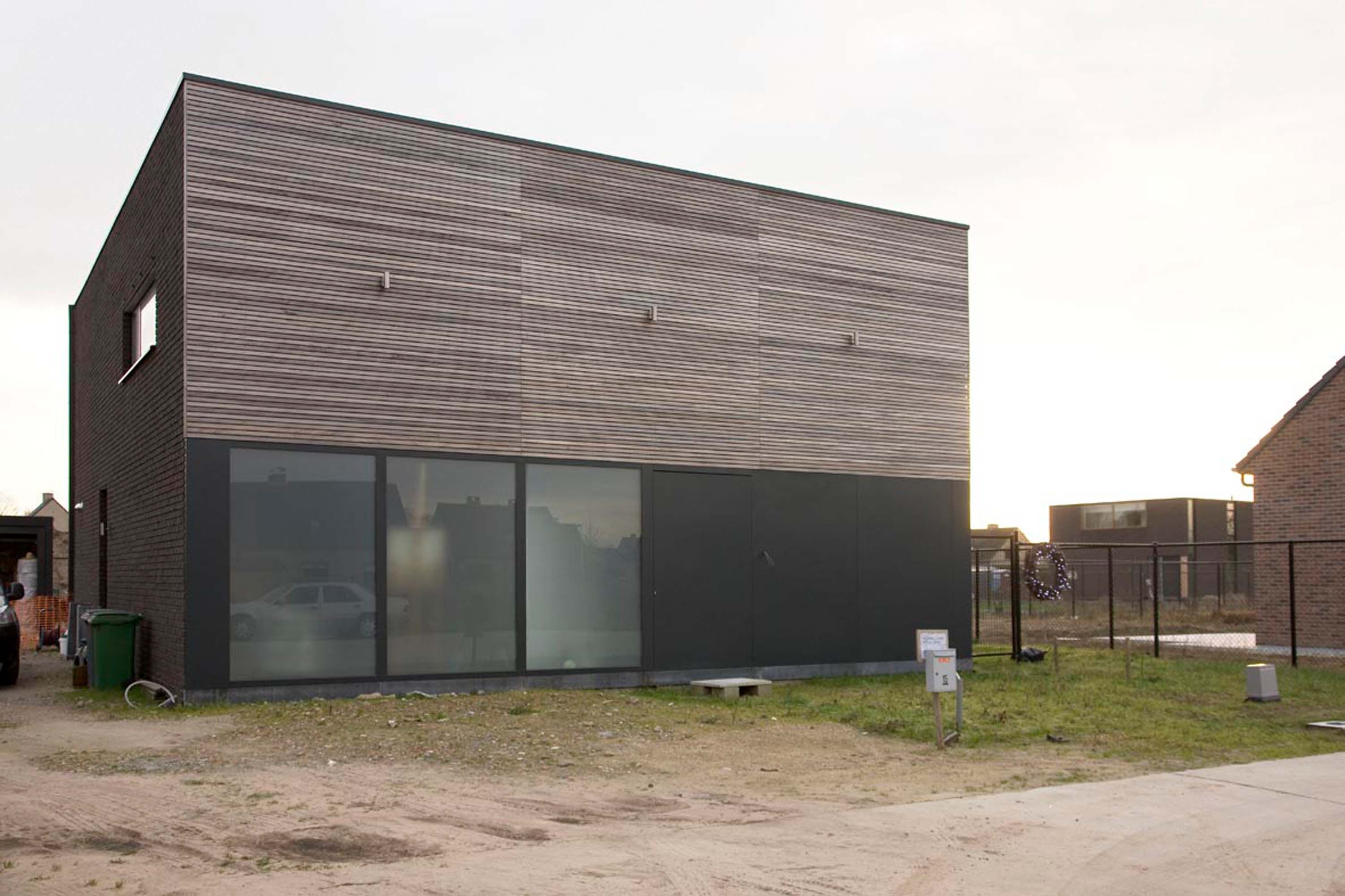 De betonnen verdiepingsvloer en de steeldeck-dakplaat worden gedragen door een staalskelet met HEB100-kolommen en IPE200-liggers. De constructie wordt integraal ingepakt met galva-binnendozen, als drager voor een houten timmerwerk. Deze opbouw maakt het mogelijk om een zwaar geïsoleerde bouwschil te realiseren. De geventileerde afwerking met traditionele gevelmaterialen reduceert de mogelijke warmtedoorslag bij een dergelijke lichte constructie.