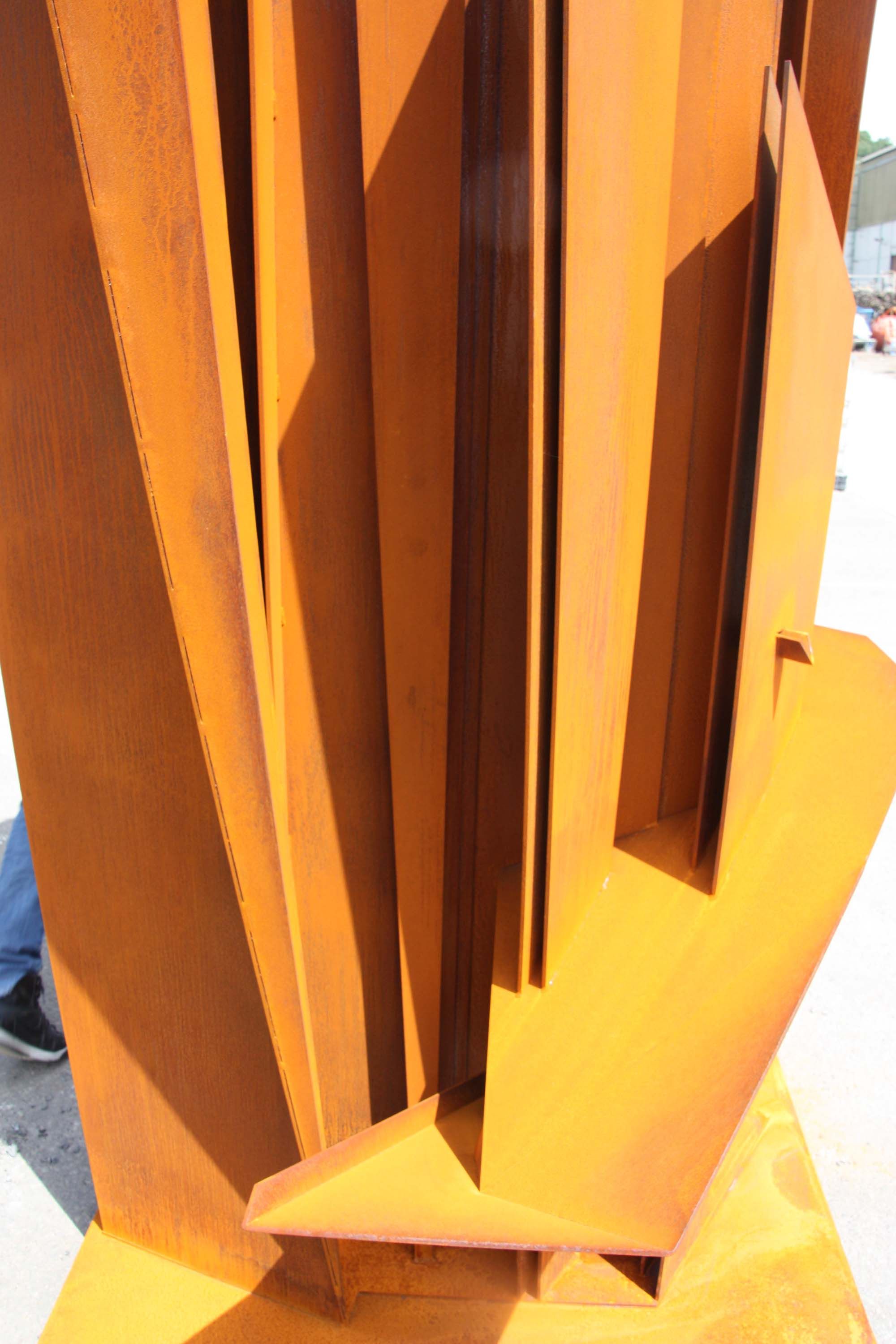 Inspiré par les qualités «ferrugineuses» de l’eau de la source, l’auteur de projet a eu l’idée de concevoir une coque constituée d’un assemblage de tôles en acier Corten©.  Pour contrer l’aspect massif imposé à l’ensemble par la disposition stricte des projecteurs d'un spectacle son et lumière, une série de lamelles confère à la sculpture un aspect dynamique, figurant une émergence du sol en direction du ciel, rappelant ainsi le jaillissement de la source. Les quatre Éléments son ainsi réunis : la tôle rouillée pour la Terre, l’Eau, le Feu avec les projections lumineuses et l’Air avec l’espace dans lequel s’inscrit le monument. Les tôles ont subi un traitement à l’acide pour en accélérer la rouille dont l’aspect brut vient en contraste avec les marbres et ors du Pavillon au centre duquel la fontaine est implantée. Pour permettre l’entretien régulier des projecteurs, et le remplacement de leurs ampoules, ceux-ci ont été montés sur un lift mécanique qui permet de les faire émerger du sommet de la statue.