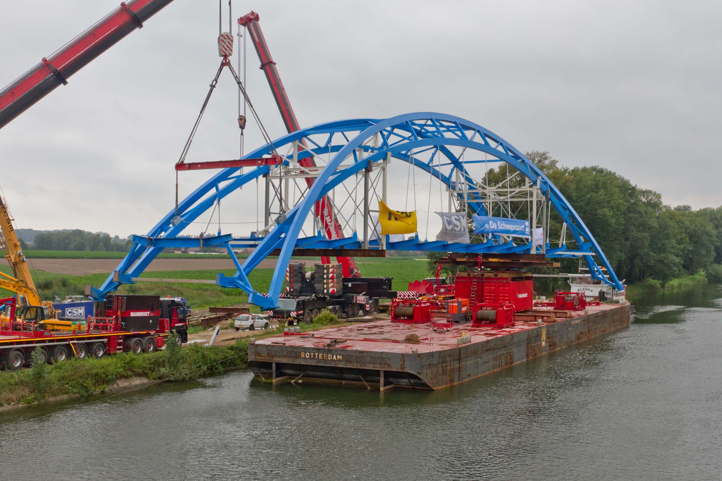 De bruggen werden voorgemonteerd naast het kanaal, waarna ze door twee kranen op een ponton werden gehesen. Eén van beide kranen reed dan naar de overzijde van het kanaal waar de brug opnieuw met twee kranen op haar plaats werd gehesen.
