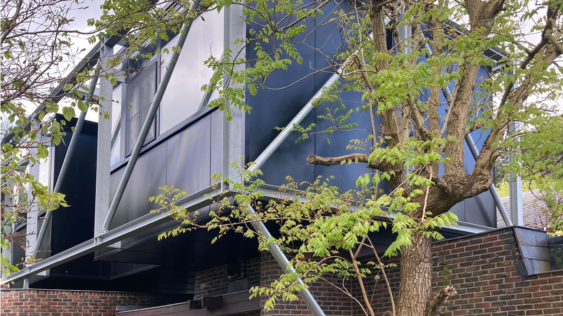 Comme la maison restera habitée pendant les travaux, le choix a été fait d'ouvrir le moins possible le toit existant et de faire flotter autant que possible une structure légère en acier au-dessus du toit actuel. Les panneaux solaires existants seront démontés et réinstallés sur la nouvelle structure.