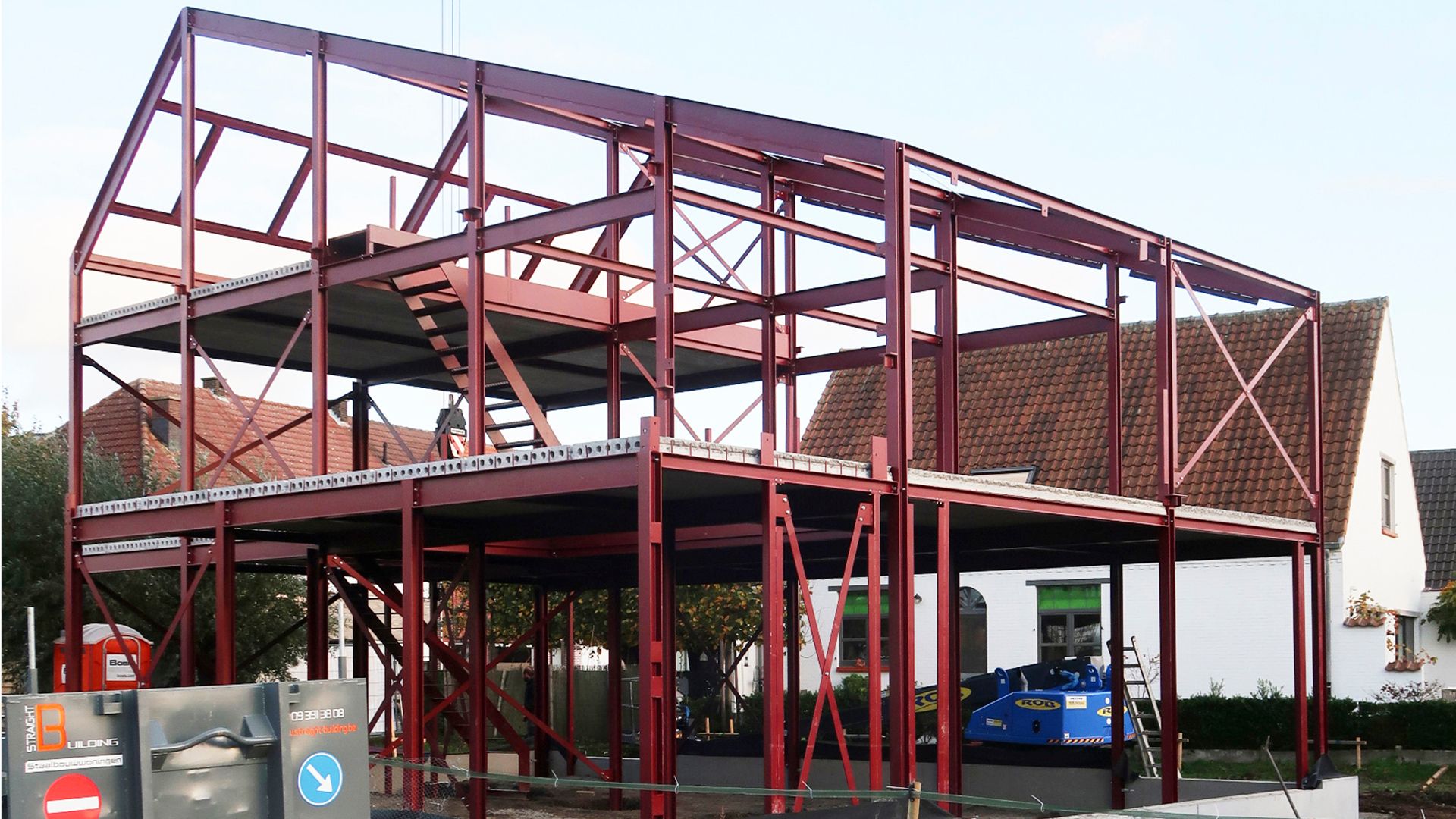 Un volume au caractère massif en panneaux de béton est flanqué d'une extension fermée en acier auto-patinable ('corten'). La patine brun de ce bardage se prolonge sur le mur mitoyen le long de la limite du terrain, de sorte à évoquer une maison individuelle. L'utilisation de l'acier corten est également répétée dans le reste de l'aménagement paysager. La forme asymétrique du toit du volume principal limite la hauteur du faîtage et définit la taille de l'espace intérieur sous les plateaux galvanisées pour peau intérieures.