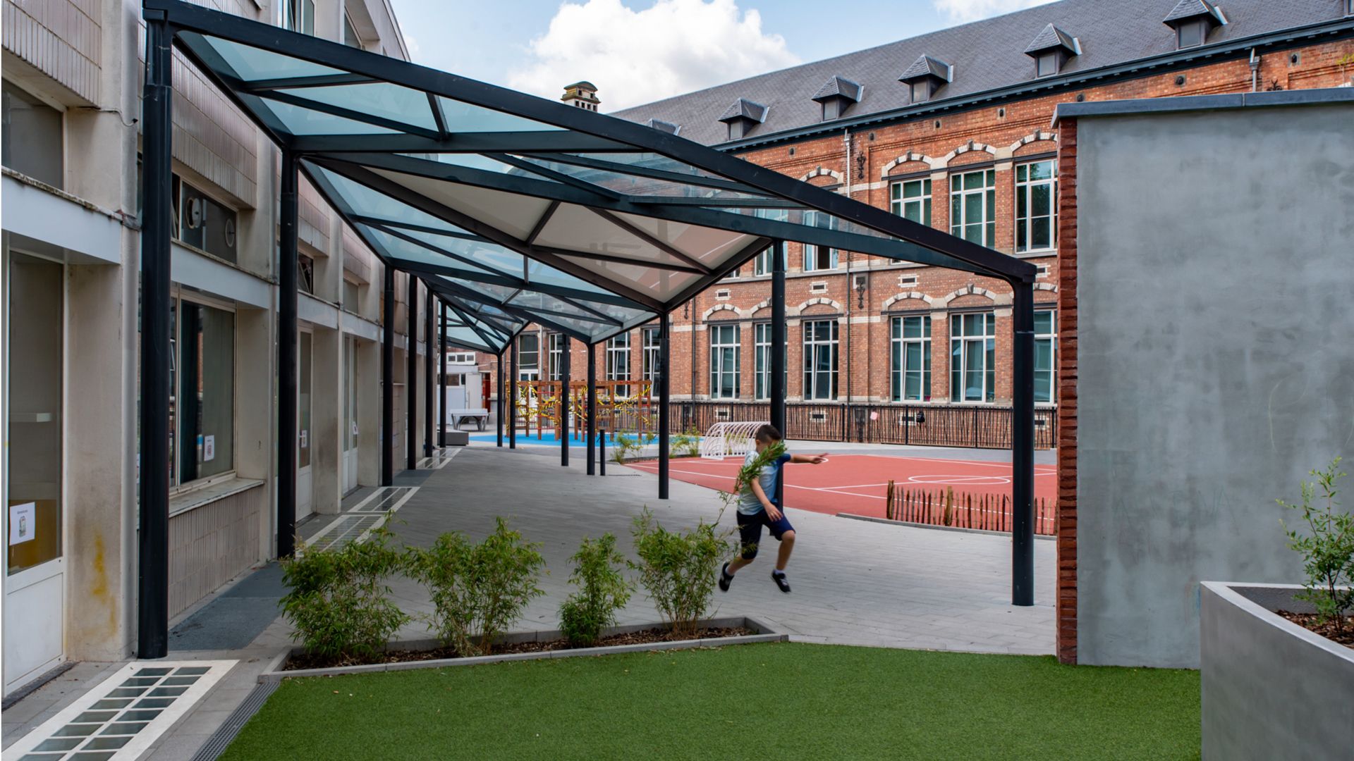 La rénovation des cours de récréation du campus Emile Bockstael à Laeken comprend la réalisation de 7 préaux en acier composés d’une structure minimaliste avec couverture en verre collée directement sur cette charpente ; d’une surface totale de 830 m².