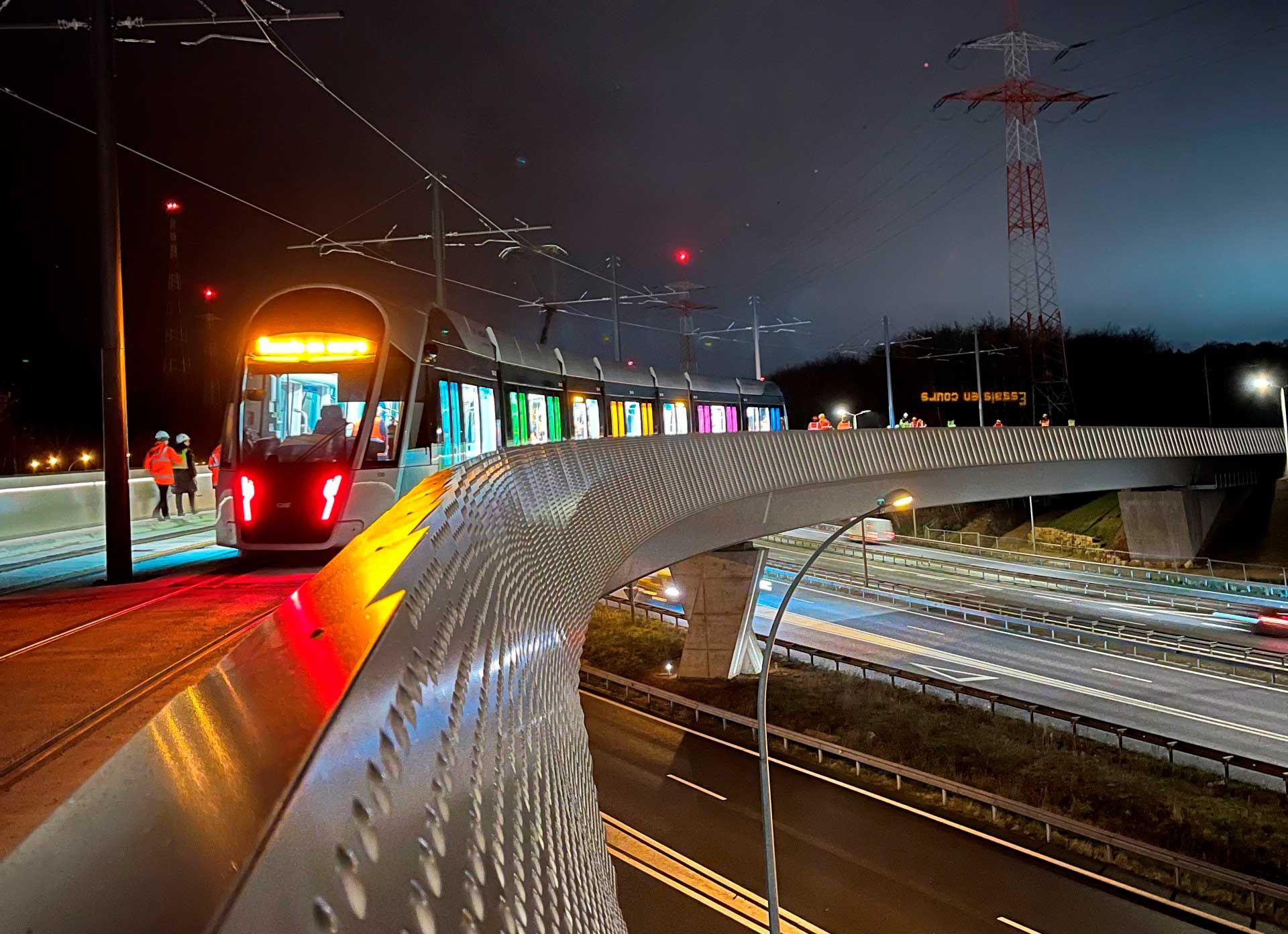 L’ouvrage OA894 constitue un pont de franchissement majeur au-dessus de l’autoroute A1 dans le cadre du prolongement de la ligne n°1 du tramway luxembourgeois vers l’aéroport du Findel. Il s’agit d’un ouvrage mixte acier-béton, composé de deux travées hyperstatiques de 45 m et 63 m, pour une portée totale de 108 m. L’implantation répond à des exigences fortes en matière de fonctionnalité ferroviaire, de contraintes autoroutières et d’intégration dans l’environnement. Le tablier supporte deux voies de tramway ainsi que deux pistes de service, présentant une largeur utile totale de 7,27 m. L’ouvrage OA894 incarne un exemple remarquable de synergie entre ingénierie structurelle avancée et design architectural intégré. Sa charpente métallique fermée assure une robustesse optimale pour un franchissement ferroviaire en courbe, tandis que son habillage en aluminium confère à l’ensemble une légèreté visuelle et une signature contemporaine. Pensé pour durer, l’ouvrage s’inscrit avec élégance dans un environnement paysager délicat, à proximité immédiate d’une zone Natura 2000.