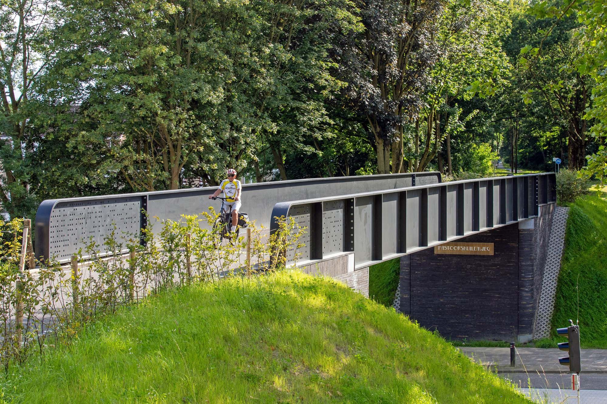 Les ponts ferroviaires miniers conçus par ipv Delft pour Hoensbroek, en Limbourg, sont deux ponts cyclables robustes en acier qui regorgent de références à la riche histoire minière du site. Le design rappelle fortement les ponts ferroviaires en acier d'antan, avec des balustrades porteuses en forme de poutres en acier avec des cloisons verticales. Grâce à une solution intelligente avec des butées qui empêchent le pont de se déplacer dans son ensemble en cas de collision, il a été possible de prendre en compte une charge d'impact relativement faible. Le résultat : un tablier de pont élancé. Les deux ponts sont identiques dans leur conception, mais diffèrent dans leurs dimensions (11x5 et 24x5 m). Tous deux sont situés sur la Parkstadroute, une nouvelle piste cyclable et un sentier de randonnée de 34 km de long qui relie les attractions naturelles et touristiques de la région du Limbourg. À Hoensbroek, la Parkstadroute se trouve en partie sur le talus de l'ancienne voie ferrée minière, et c'est précisément là que se trouvent ces ponts en acier.