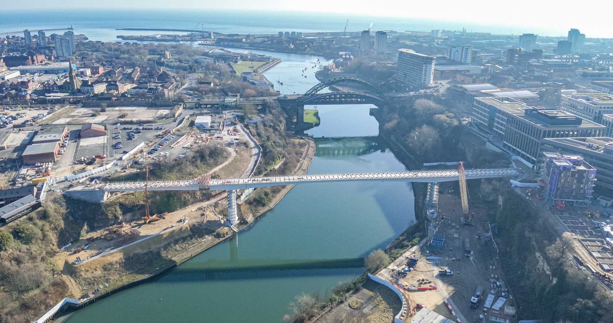 Le 'Keel Crossing' à Sunderland dans le nord-est de l'Angleterre, est un nouveau point de repère dans le paysage urbain et fait partie du projet Riverside Sunderland. Le pont relie Keel Square au quartier de Sheepfolds, près du Stadium of Light. Conçu par Knight Architects et Arup, consiste d'une poutre principale en acier de 250 m de long et 7,5 m de large en forme de trapèze (1180 tonnes, S460) avec des panneaux de tablier en béton, à plus de 30 m au-dessus de la rivière Wear. Le résultat est un passage spacieux pour les piétons et les cyclistes, tout en permettant la libre circulation des bateaux. Victor Buyck Steel Construction a fabriqué la structure en acier en Belgique, divisée en quatre segments. La hauteur variable et le positionnement précis des goujons exigeaient une grande précision. À Wondelgem, les éléments ont été assemblés, conservés et équipés de Tuned Mass Dampers. Le montage à Sunderland s'est déroulé en deux phases à l'aide de pontons et de grues Mammoet. La travée centrale de 105 m a été soulevée à l'aide de vérins de levage et reliée aux autres segments. Après la mise en place, ont suivi les panneaux en béton et les finitions. Depuis son ouverture en août 2024, le pont a suscité beaucoup d'intérêt et est devenu un maillon essentiel pour des milliers d'utilisateurs quotidiens.
