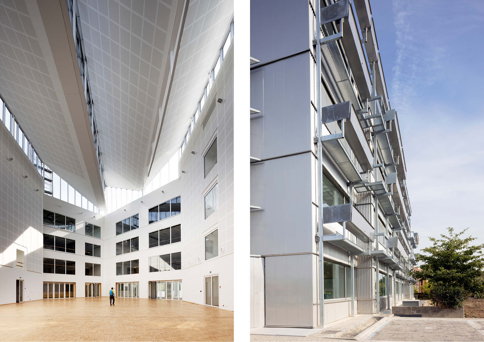 Er werd een groengevel geconcipieerd als een onafhankelijke structurele laag, een tweede bewoonbare gevel die de bestaande structuur niet verticaal belast met het gewicht van de modulaire minituinen. De ontkoppeling van de verschillende materialen, waaronder verzinkt en roestvast staal vergden bijzondere detaillering. Voor de overkapping werd een atypisch sheddak geconcipieerd. De grootste diagonale overspanning meet 36m en wordt gerealiseerd door middel van vakwerk in het verticaal glasvlak. Ten slotte werd als gevelbekleding een semi-reflecterende RVS- plaat voorzien.