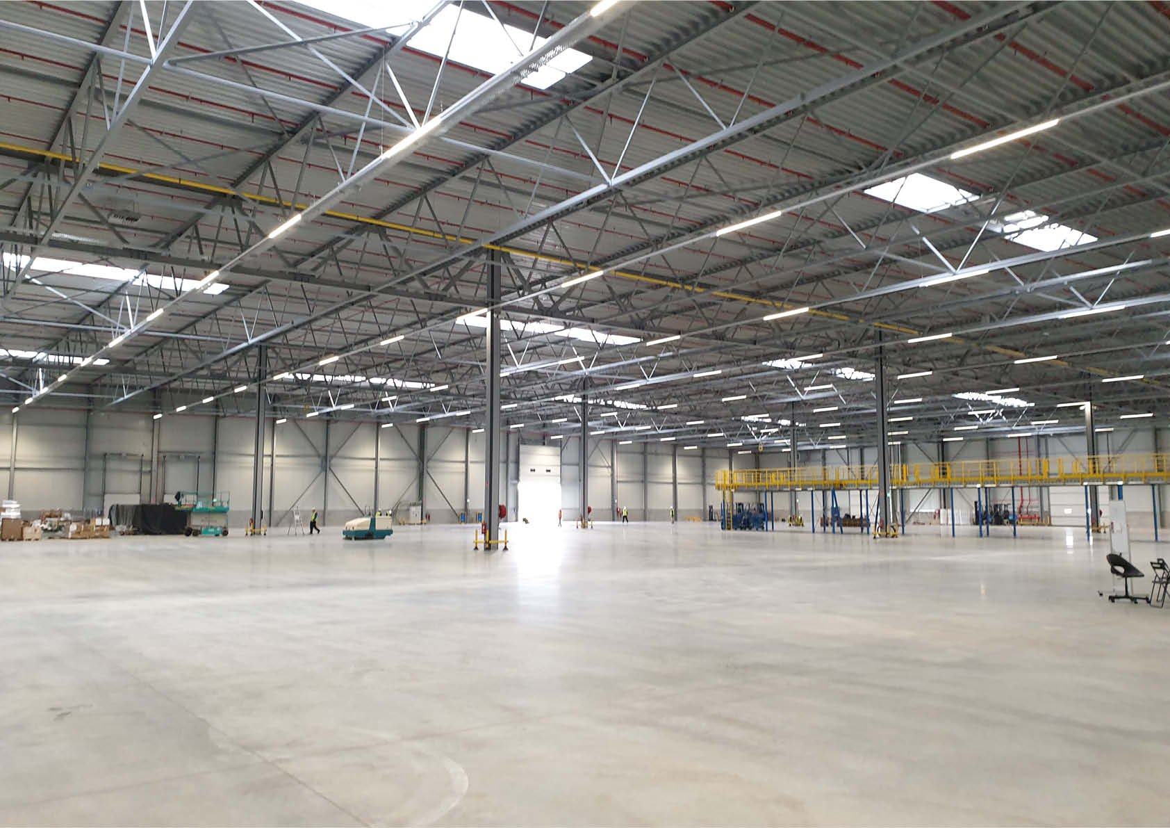 Dit grootschalige project omvat een prefabbetonnen kantoorgebouw van 3200 m² en een enorme logistieke hal van 30.000 m², die is opgetrokken in staal. Deze laatste bestaat uit een regelmatig ras-ter van kolommen. Alle dakbalken, zowel de hoofd- als de secundaire liggers, zijn opgevat als stalen vakwerkliggers, die behandeld zijn met brandwerende REI30-verf.