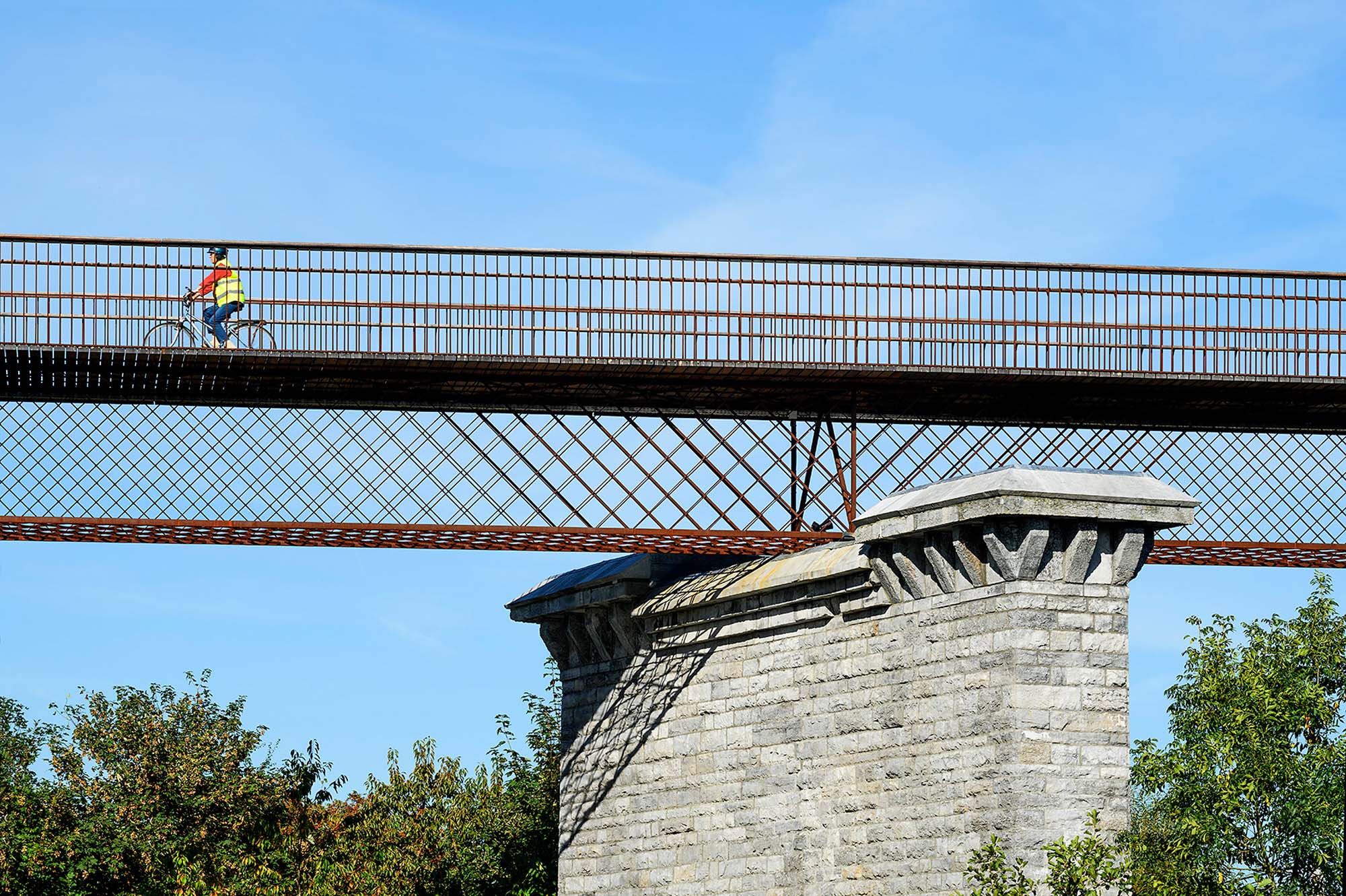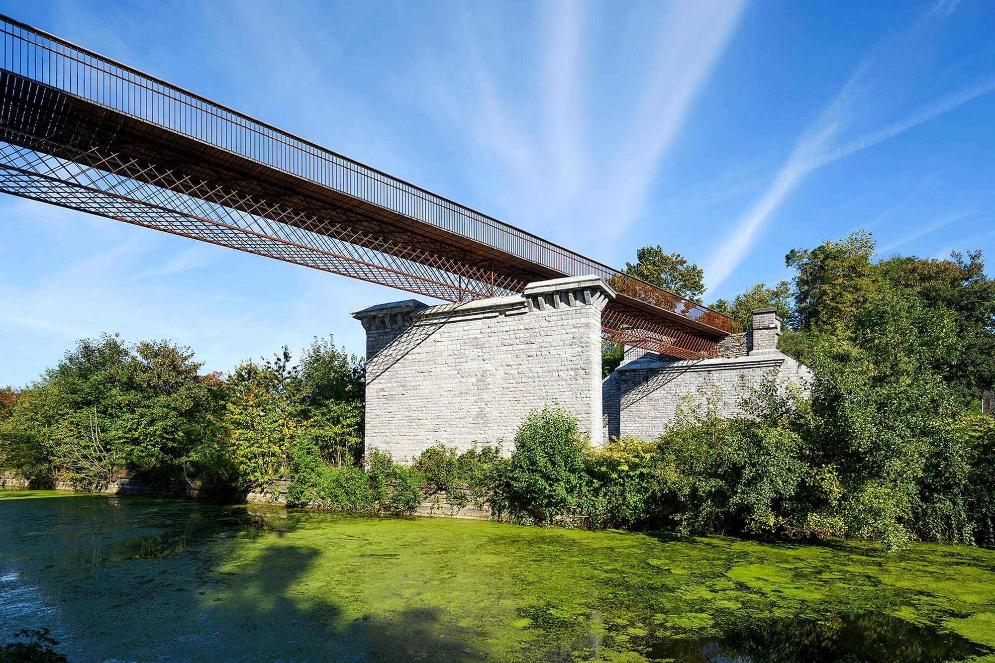 Het is een 54 m lange weervast stalen voetgangersbrug met twee traveeën. De voetgangersbrug is geplaatst op de voormalige landhoofden en pijlers van een spoorwegbrug die na Wereldoorlog II werd ontmanteld.