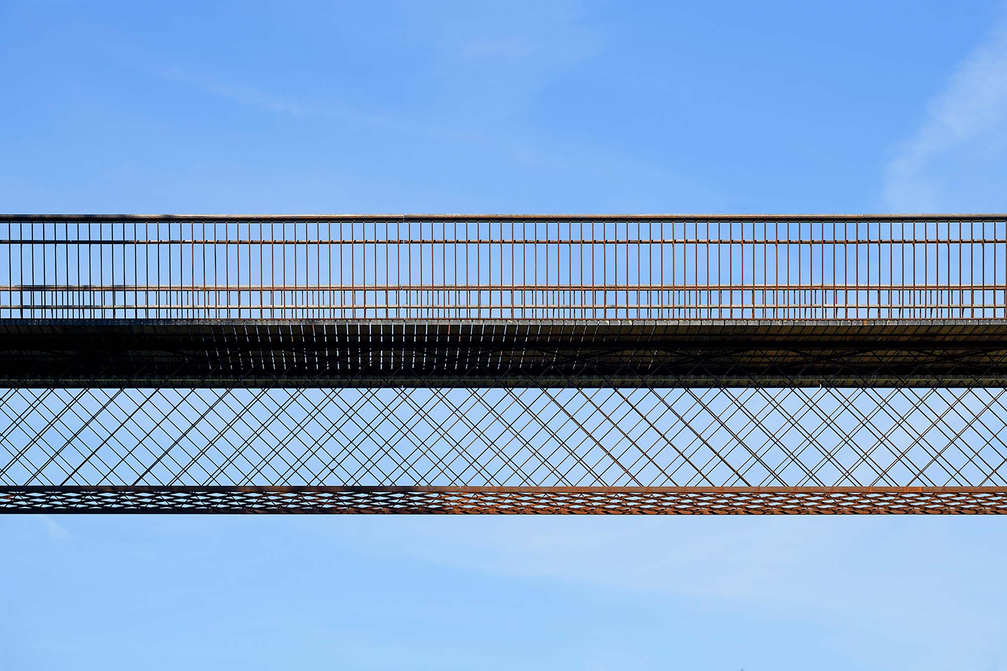 Om het karakter van de oude brug te hernemen, bestaat het ontwerp van de voetgangersbrug uit een kokerliggerconstructie waarvan de vlakken zijn opgebouwd uit een vakwerk met een raster op 45°. De elementen van dit raster bestaan uit staven van 80 x 60 mm² en de wanden van het ‘caisson’ zijn opgebouwd uit een raster van staven van 30 x 12 mm² met een tussenafstand van 35 cm. Deze staven van het vakwerk zijn op elk kruispunt aan elkaar gelast om de stabiliteit te garanderen, en aan de randstaven vastgelast.
