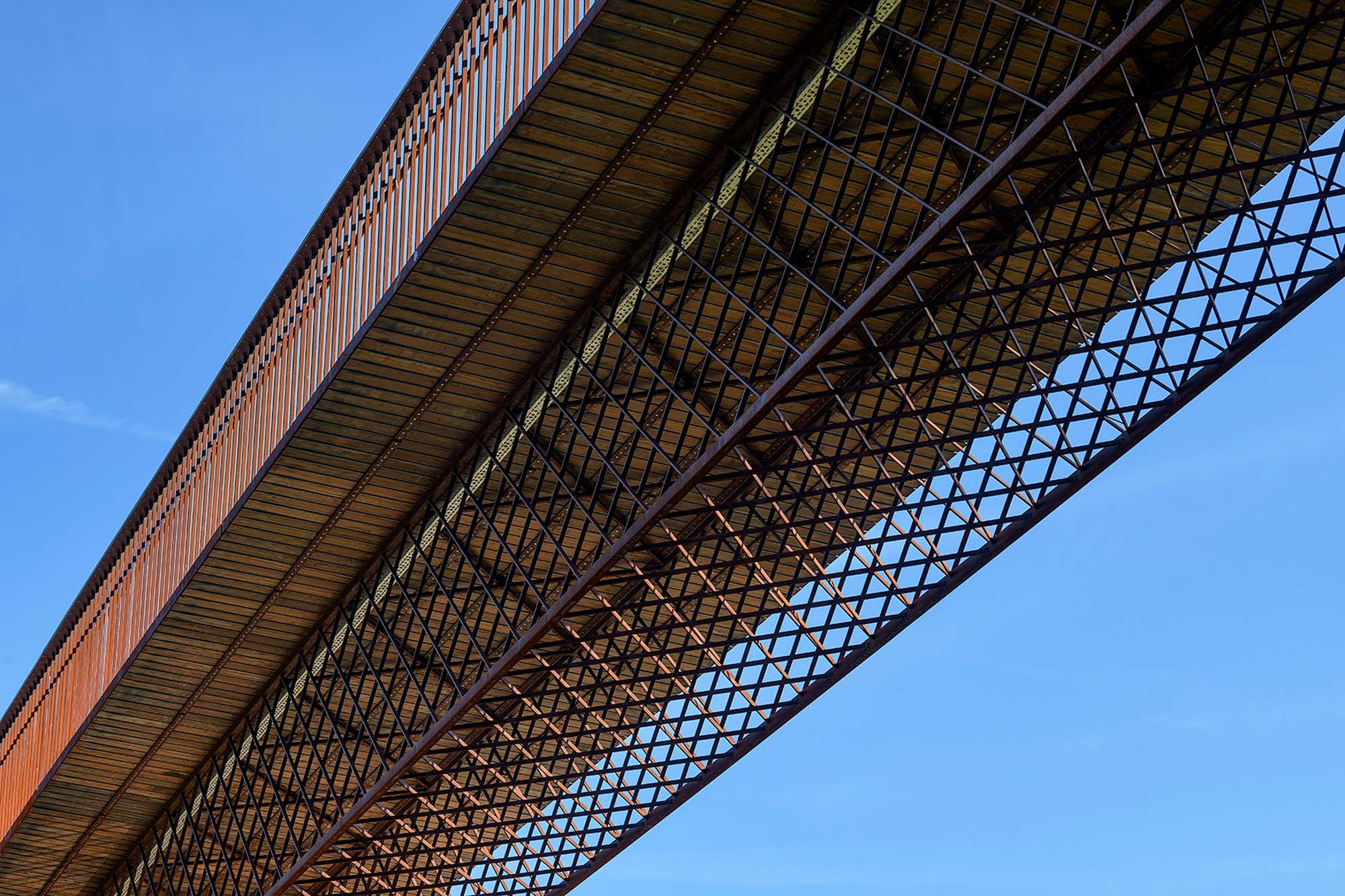 Deze structuur is bedekt met een houten (azobe) brugdek waarvan de planken rusten op de twee vakwerkelementen en één meter uitkragen.